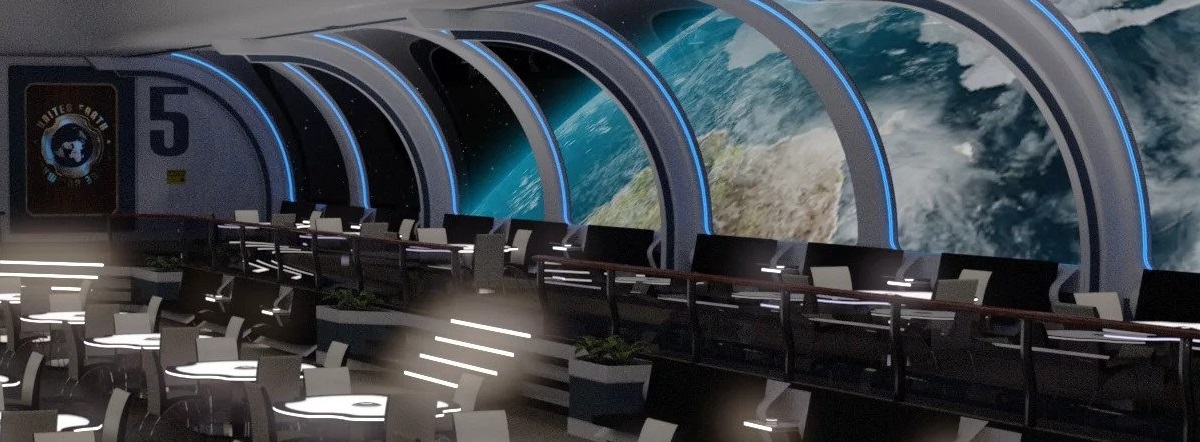 After liftoff, passengers can stand and mingle in the on-board bar/restaurant while admiring the scenery. Crew-only spaces include a small cockpit in the nose a few steps down from the bar/lounge, a small engine room directly aft, and a galley serving the restaurant (also aft).