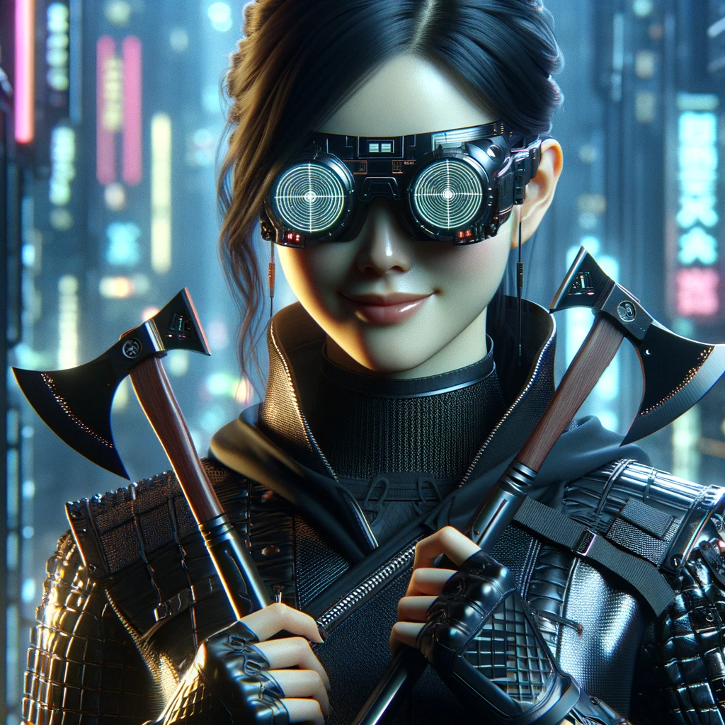 Mahaena habitually wears blacked-out scanning goggles, a black trenchcoat, and high black boots. Underneath, Mahaena is sporting a shoulder holster under each arm with one throwing axe each. To make those axes really fly, she dug up a black-market Night City clinic and had some muscle grafts stapled in. They work great, mostly: she didn’t pay top dollar and it shows.